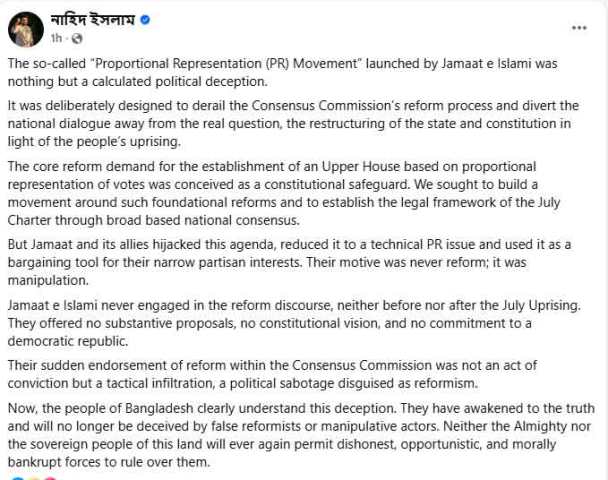 জামায়াতে ইসলামীর তথাকথিত আনুপাতিক প্রতিনিধিত্ব (পিআর) আন্দোলন একটি পরিকল্পিত রাজনৈতিক প্রতারণা ছাড়া কিছুই ছিল না বলে মন্তব্য করেছেন জাতীয় নাগরিক পার্টির (এনসিপি) আহ্বায়ক নাহিদ ইসলাম।